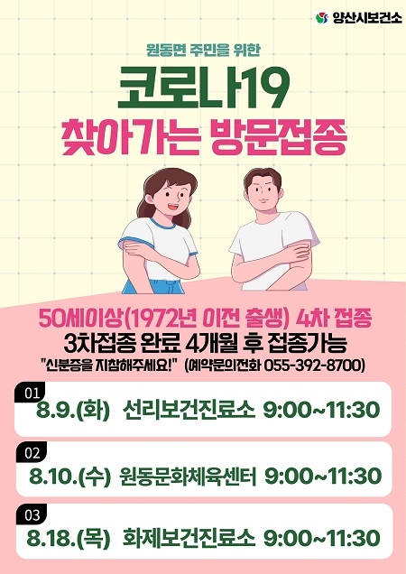 또 50세 이상 4차 접종대상자 및 기초(1~3차) 미접종자 예약은 양산시보건소 콜센터 또는 읍면동 행정복지센터에서 가능하며 당일접종을 원하는 경우 SNS(네이버, 카카오톡)을 통한 잔여백신 예약 및 104개소 위탁의료기관 문의를 통해서도 가능하다.