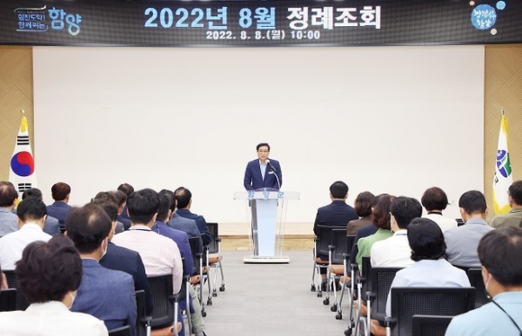 진병영 함양군수가 만선 8기 첫 직원 정례조회를 열고 소통과 청렴을 바탕으로 '힘찬도약! 함께여는 함양'을 만들기 위해 다함께 동참해 줄 것을 당부했다.