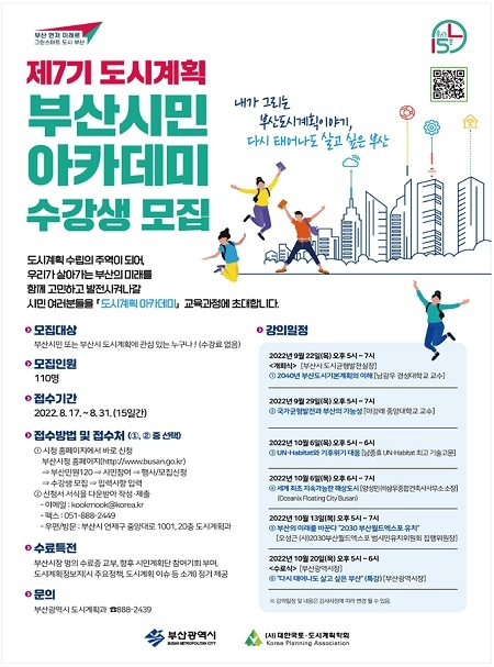 부산시는 민선 8기 시정의 도시비전에 대한 이해와 공감대를 확산하고 도시계획에 시민참여를 활성화하기 위해 오는 17일부터 31일까지 '제7기 도시계획 부산시민 아카데미' 수강생을 모집한다고 12일 밝혔다.