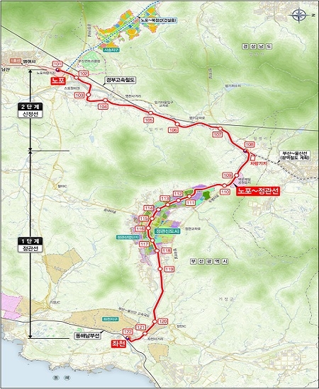 시는 지난 1월 '도시철도망 구축계획' 변경 시 기존 신정선(노포~월평)과 정관선(월평~정관~좌천)을 노포~정관선으로 병합하고, 전체 구간 중 월평~좌천구간을 1단계로 노포~월평구간을 2단계로 나눠 '도시철도망 구축계획'에 반영했다. 이번 예비타당성조사 신청은 도시철도망 구축계획의 투자우선순위에 따라 1단계 구간을 우선 추진하는 것.