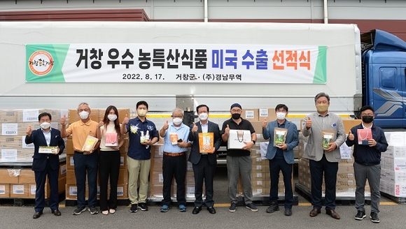 경남 거창군은 17일 남상면 소재 ㈜농업회사법인 하늘바이오에서 구인모 군수를 비롯한 관계자 11명이 참석한 가운데 '거창군 농특산식품 미국 온·오프라인 안테나숍 운영'을 위한 미국 수출 선적식을 가졌다.