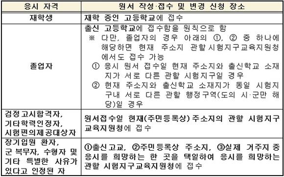 응시 자격에 따라 원서 작성과 접수, 변경 신청 장소는 다음 표를 참고하면 된다.