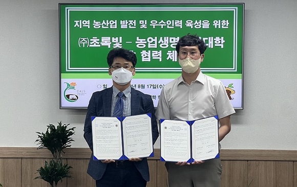 경상국립대학교는 농업생명과학대학과 ㈜초록빛이 17일 학장실에서 지역 농산업 발전 및 우수 전문인력 육성을 위해 상호협력 협정을 체결했다고 밝혔다.