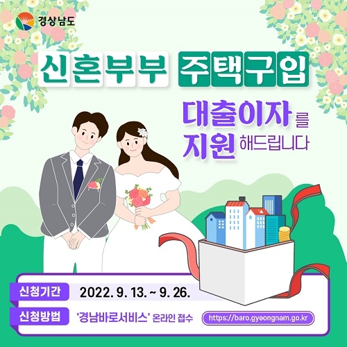 경남도는 민선 8기 도정과제 중의 하나인 '신혼부부 주택구입 대출이자 지원사업'을 시행한다고 24일 밝혔다.
