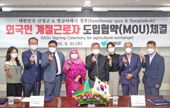 산청군은 31일 방글라데시 해외고용서비스(BOESL)와 외국인 계절근로자 도입 등 교류에 관한 업무협약(MOU)을 체결했다고 밝혔다.