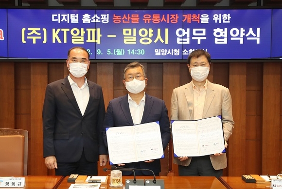 경남 밀양시는 5일 시청 소회의실에서 디지털 홈쇼핑 업계 선두주자인 ㈜KT알파(이하 KT알파 쇼핑)와 지역 농특산물 판로 확대 및 유통 활성화를 위한 업무협약을 체결했다.