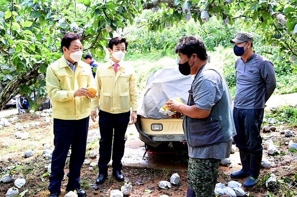 박완수 경남도지사와 조규일 진주시장이 지난 6일 태풍 '힌남노' 북상으로 피해가 발생한 문산읍 두산리 소재의 들녘과 과수원 등 현장을 방문, 피해 농가를 위로하고 피해 과수에 대해 철저한 피해조사와 신속한 복구가 이뤄지도록 지시했다.