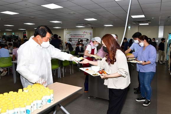 시는 전문쉐프 3명을 초청해 찹스테이크, 크림파스타 등 선호도가 높은 요리를 만들어 제공했다. 특히 나동연 시장과 이종희 의장은 양산에서 생산된 요구르트를 직접 배식하며 직원들을 격려했고, 함께 식사를 하며 소통의 시간을 가졌다.