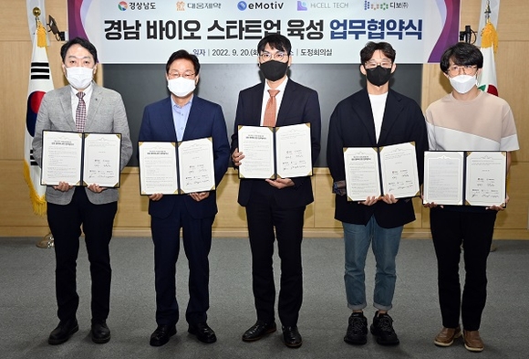 경남도는 20일 도청 도정회의실에서 대웅제약과 ㈜이모티브, ㈜하이셀텍, 디보㈜ 등 도내 기업체와 함께 바이오 스타트업에 대한 성장과 투자유치를 지원하기 위한 업무협약을 체결했다.