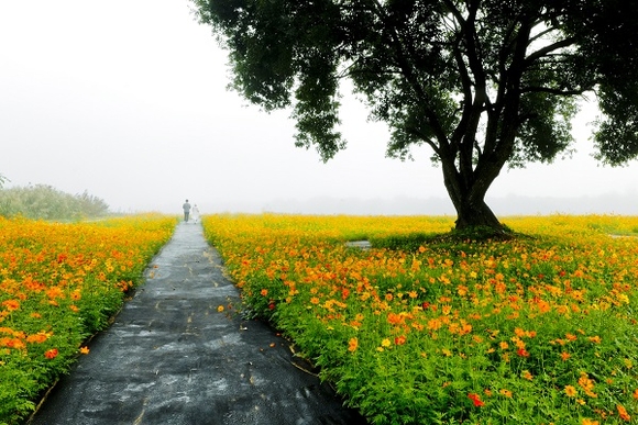 29일 경남 합천군 합천읍 영창리 핑크뮬리단지 일원에 식재한 황코스모스가 황강변에 만개해 MZ세대와 꽃 애호가들의 사진촬영 명소로 각광받고 있다. (사진=합천군 제공)