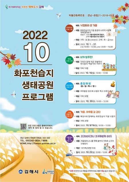 자세한 내용 확인과 신청은 화포천습지생태공원 누리집에서 할 수 있으며, 문의는 전화로 하면 된다.