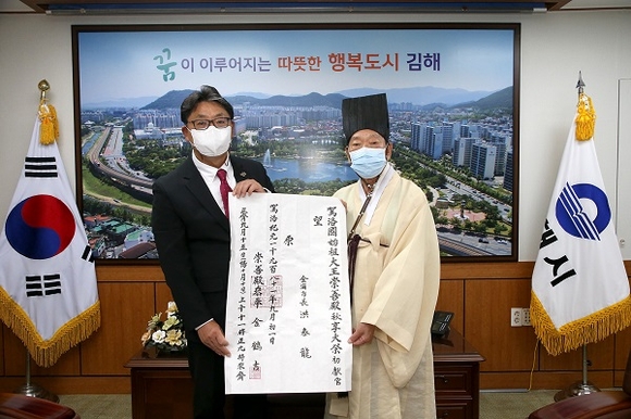 경남 김해시는 5일 시청 시장실에서 숭선전 추향대제 초헌관으로 홍태용 시장을 추대하는 망장(望狀) 전달식을 가졌다고 밝혔다.