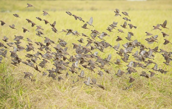 6일 경남 함양군 함양읍 한들 들녘에서 참새떼가 잘 익은 나락을 까먹다가 인기척에 놀라 날아가고 있다. (사진=함양군 제공)