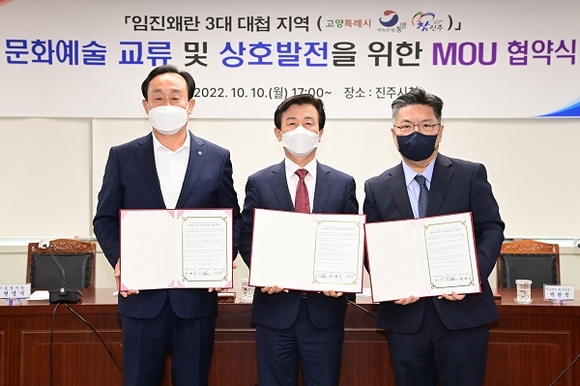 이번 협약식은 올해 2월 임진왜란 3대첩 지역인 진주·통영·고양시의 축제·문화예술 교류 협의에 따른 것. 협약식에는 조규일 진주시장, 천영기 통영시장, 박원석 고양시 제1부시장이 참석했다.