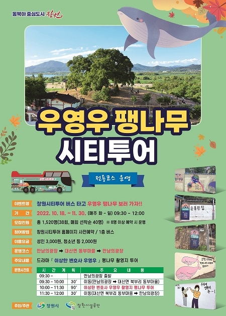 경남 창원시는 '우영우 팽나무'를 보러 가는 시티투어버스 특별노선 운영 기간을 연장, 오는 11월 30일까지 참가자를 모집한다고 17일 밝혔다.