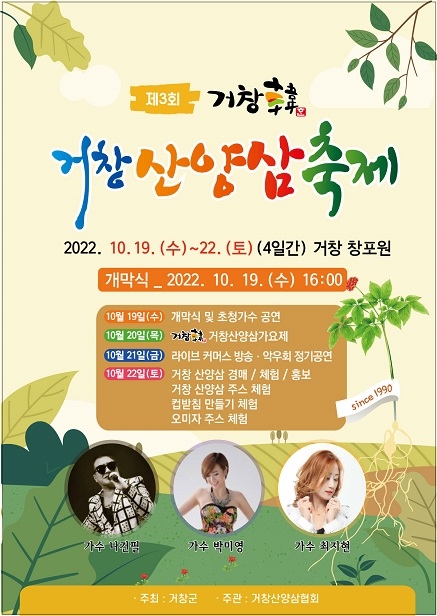 축제는 개막식을 시작으로 거창산양삼 홍보 및 판매부스, 축하공연, 전국가요제, 산양삼 판매 라이브 커머스, 산양삼 경매 행사와 체험 프로그램 등 다채로운 행사로 구성될 예정이다.
