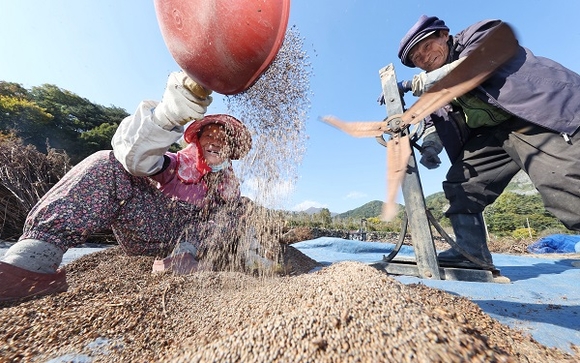 25일 경남 함양군 마천면 금계마을 들깨밭에서 노부부가 가을걷이를 하고 있다. (사진=함양군 제공)