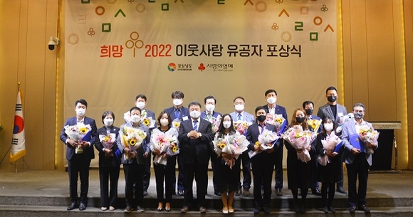 한편 희망 2022 이웃사랑 유공자 포상식은 코로나19 여파와 경남지역의 경기 불황이 이어지고 있는 상황에서 소외된 이웃을 위해 나눔을 실천하고 복지 사각지대를 발굴해 풀뿌리 나눔문화 확산에 기여한 유공자들에게 감사의 마음을 전하고자 마련됐다.