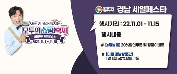 경남도는 대한민국 쇼핑주간인 '2022 코리아세일페스타'와 연계해 11월 1일부터 15일까지 다양한 할인행사 및 이벤트를 추진한다고 31일 밝혔다.