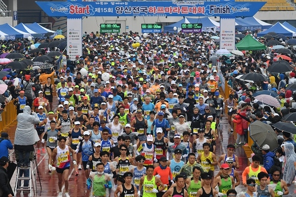 대회는 당일 오전 9시 양산종합운동장 주경기장에 집결, 몸풀기를 한 뒤 9시 30분부터 하프, 10㎞, 5㎞ 부문별로 15분 간격으로 출발해 영대교를 지나 양산천변 도로를 따라 통도사 방향으로 달리다 부문별 반환점을 돌아 종합운동장으로 돌아오는 코스로 진행된다.