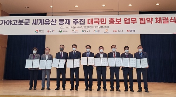 이번 업무협약은 가야를 대표하는 문화유산인 가야고분군 세계유산 등재의 성공을 기원하고, 범국민적 관심을 높이기 위해 9개 기관이 홍보를 위한 협력체계를 구축하기 위해 마련됐다.