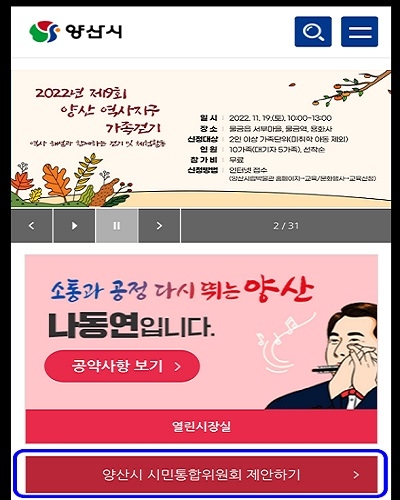 경남 양산시는 시민들의 아이디어를 시민통합위원회와 연계해서 시민과 소통을 강화하고, 아이디어의 실행가능성을 높이기 위해 시 홈페이지에 '시민통합위원회 제안하기' 게시판을 운영한다고 16일 밝혔다.