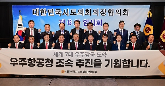 또한 이 자리에서 시도의회의장들은 우주항공청 조속 설립 추진을 기원하는 현수막을 들고 우주항공 강국 도약을 한마음으로 염원했다.
