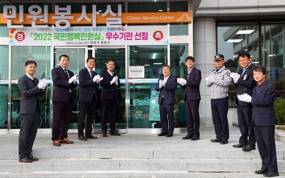 경남 밀양시는 지난달 30일 행정안전부 주관 2022년 국민행복민원실 인증 우수기관에 선정돼 시청 민원실에서 현판식을 가졌다.