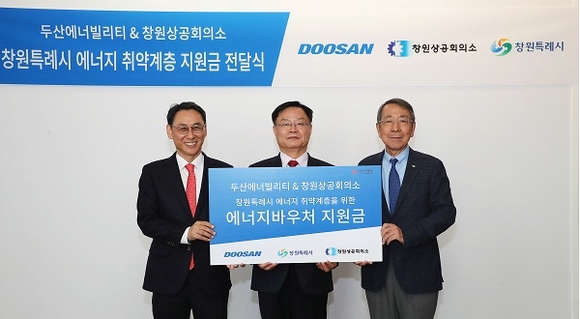 경남 창원시는 두산에너빌리티와 창원상공회의소가 16일 오전 11시 두산에너빌리티 회의실에서 에너지취약계층에 동절기 난방비 8천만 원을 기탁했다고 밝혔다.