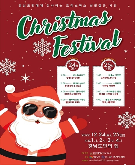 다가오는 크리스마스에는 (사)한국예총 경남연합회가 주관해 '크리스마스 페스티벌'이 열릴 계획이다. 크리스마스 페스티벌은 '경남도민에게 선사하는 크리스마스 선물 같은 시간'이라는 주제로 24, 25일 양일간 오후 1시부터 4시까지 매시간 다양한 행사가 준비돼 있어 방문객들에게 크리스마스의 특별한 추억을 더할 예정이다.