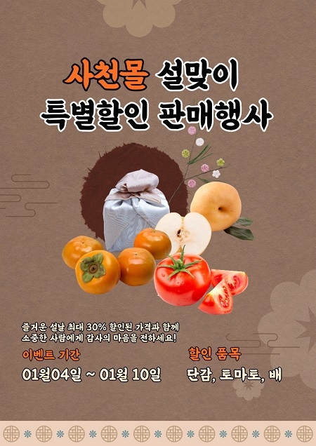 경남 사천시는 내년 1월 4일부터 10일까지 '2023년 사천몰 설맞이 특별할인 판매행사'를 진행한다고 30일 밝혔다.