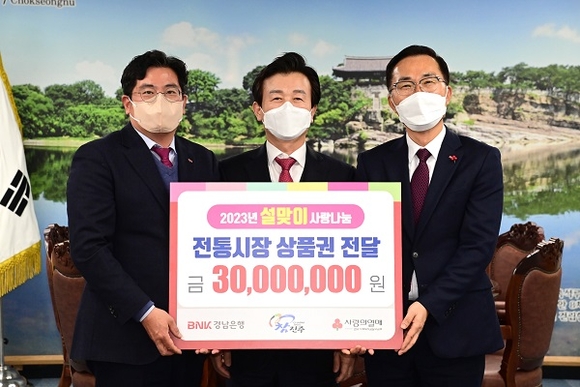 경남 진주시는 5일 시청 기업인의 방에서 BNK경남은행이 제공하는 새해 설 명절 어려운 이웃돕기 성품 기탁식을 가졌다.
