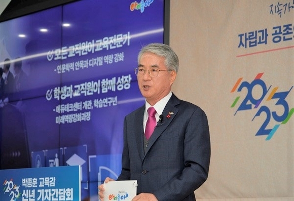 박종훈 경남도교육감이 12일 오전 교육연수원 세종홀에서 신년 기자간담회를 열고 “미래를 위한 학생 맞춤형 교육과 생태전환 교육을 통해 자립과 공존의 경남교육을 실현하겠다”고 밝혔다.
