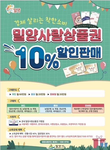 시 관계자는 “밀양사랑상품권이 단순 현금 지원이 아닌 실질적인 시민 가계 경제에 보탬이 되고, 어려움을 겪고 있는 소상공인과 경제회복에 도움이 될 수 있도록 최선을 다하겠다”고 밝혔다.