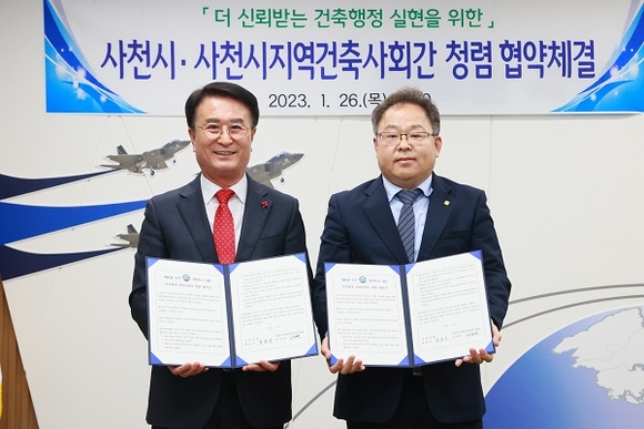 사천시와 시 지역건축사회는 26일 시청 6층 열린시장실에서 박동식 시장, 이상만 회장 등 10여명이 참석한 가운데 청렴 협약을 체결했다.