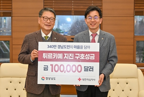 경남도는 15일 오후 도청 접견실에서 튀르키예 국민을 돕기 위한 10만 달러의 긴급구호금을 대한적십자사에 전달했다.