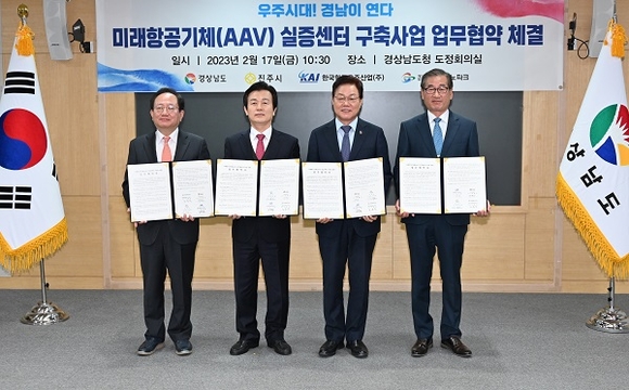 경남도는 17일 오전 도청 도정회의실에서 진주시, 한국항공우주산업(KAI), 경남테크노파크(경남TP)와 함께 미래항공기체(AAV, Advanced Air Vehicle) 실증센터 구축을 위한 업무협약을 체결했다.