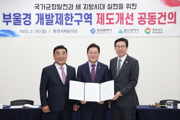 경남도는 20일 오전 통영국제음악당에서 박완수 도지사를 비롯해 박형준 부산시장, 김두겸 울산시장과 부울경 기획조정실장, 담당국장, 산하 연구원 관계자 등 20여 명이 참석한 가운데 '부울경 3개 시·도 개발제한구역 제도개선 공동건의 행사'를 열고 3개 시·도지사의 공동건의문 서명과 발표를 가졌다.