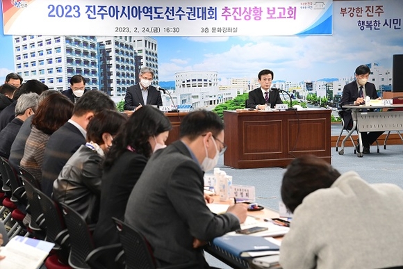 경남 진주시는 지난 24일 시청 3층 문화강좌실에서 조규일 시장 주재로 대한역도연맹, 진주시체육회, 진주시역도연맹, 진주문화관광재단 등 유관기관과 관련부서 공무원 등 77명이 참석한 가운데 '2023 진주아시아역도선수권대회 추진상황 보고회'를 가졌다.