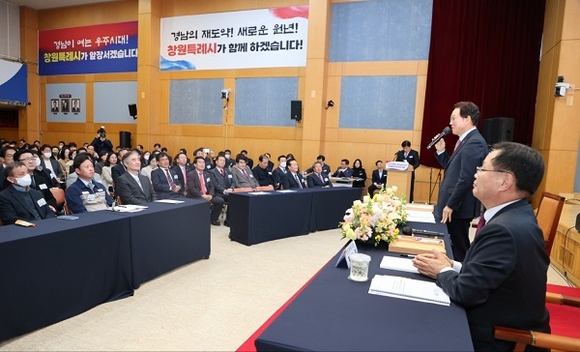 박 도지사는 이날 창원시청 시민홀에서 열린 도민과의 대화에서 “창원은 인구로는 경남의 3분의 1이지만, 산업경제는 절반을 차지하는 만큼 창원의 발전이 경남의 발전”이라며 “창원국가산단 조성 반 세기를 즈음해 창원이라는 도시와 산단의 미래 50년을 위한 큰 그림을 그려야 한다”고 말했다.