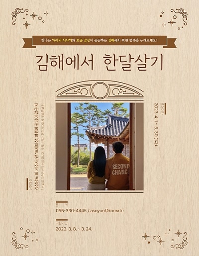 시 관계자는 “생활형 지역관광이 새로운 여행 트렌드로 떠오름에 따라, 장기체류형 여행 지원사업을 진행한다”며 “많은 사람들이 '요즘 김해, 지금 여행'에 신청하여 체류형 여행을 경험해 보았으면 한다”고 말했다.