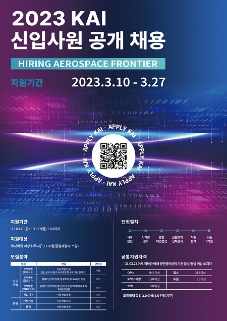한편 KAI는 지난 6일부터 서울 및 수도권, 지역 거점 12개 대학교에서 개최하는 대규모 채용박람회 참가와 함께 캠퍼스 리쿠르팅을 진행하고 있다.