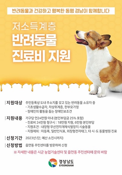경남도는 경제적 여건으로 적기에 치료받지 못하고 있는 반려동물에 대한 진료비 지원으로 동물보건 향상에 기여하고자 저소득계층 반려동물 진료비 지원사업을 추진한다고 10일 밝혔다.