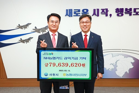 NH농협 사천시지부는 13일 사천시청을 방문해 지난해 제휴카드 사용에 따른 포인트 적립기금 7964만 원을 박동식 시장에게 전달했다.