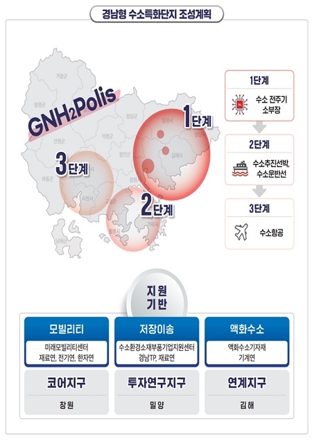 이에 도는 기반시설(인프라) 구축을 통한 수소산업 생태계 확장을 추진한다. 이를 위해 우선 밀양에 수소환경 소재부품 기원지원센터(밀양, 23~26, 총사업비 410억원(지방소멸대응기금 373억원))를 설립하고, 창원을 중심으로 김해, 밀양과 연계하는 수소특화단지(창원·밀양·김해, 총사업비<23~26년> 1조 550억원, 1단계 3348억원, 2단계 7202억원) 우선 지정·조성을 추진할 예정이다. 더 나아가 한국수소기술원을 유치할 예정이다.