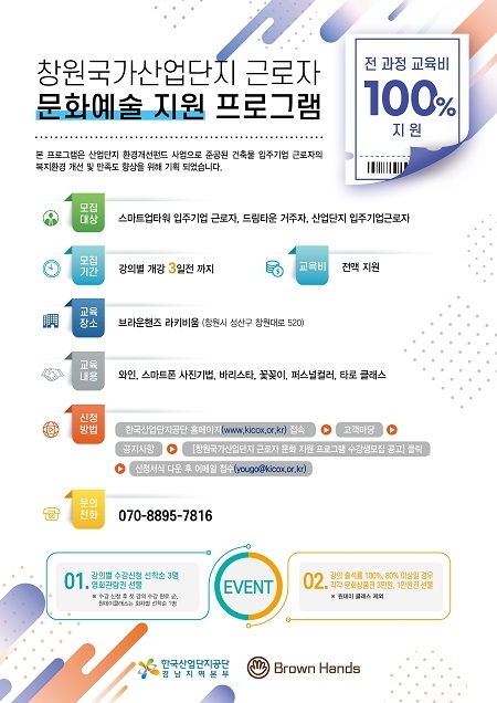한국산업단지공단 경남지역본부는 '창원국가산업단지 근로자 문화·예술 지원 프로그램' 수강생을 모집한다고 16일 밝혔다.