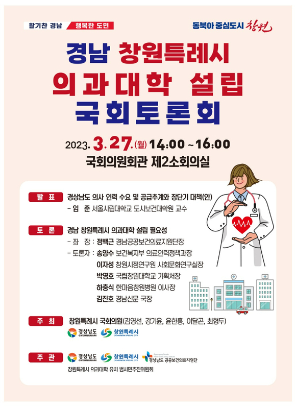 '창원특례시 의과대학 설립' 공론화를 위한 국회 토론회가 오는 27일 오후 2시 의원회관 제2소회의실에서 열린다.