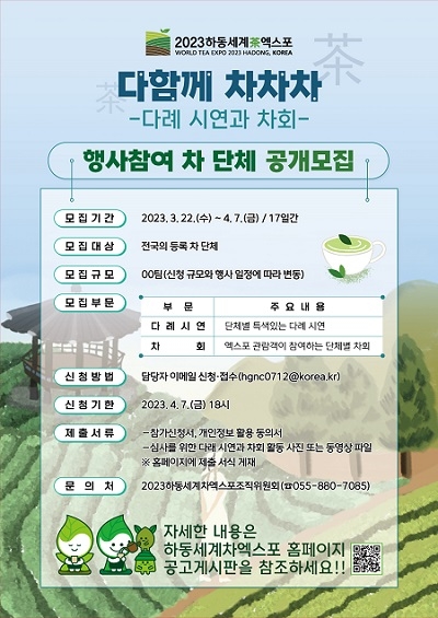 하동세계차엑스포조직위원회가 '다함께 차차차'라는 주제로 다례시연과 차회 행사에 참여할 차 단체를 공개 모집한다.