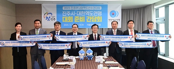 '2023 진주아시아역도선수권대회' 협업을 위해 진주시와 대한역도연맹 간 대회 준비 간담회가 지난 23일 서울올림픽파크텔에서 있었다.