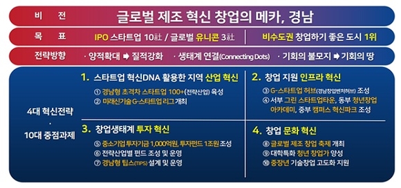 향후 10년간 글로벌 투자 방향이 컴퓨터 의존 산업(Bit)에서 스마트 제조 등 실물자산 연관산업(Atom)으로 재이동할 것으로 전망됨에 따라 '글로벌 제조 혁신 창업의 메카, 경남'이라는 미래 비전을 설정하고, ▲스타트업의 혁신 DNA를 활용한 지역 산업 혁신 ▲창업 지원 기반시설(인프라) 혁신 ▲창업생태계 투자 혁신 ▲창업 문화 혁신으로 4대 혁신전략을 수립했다. 이에 따른 10대 중점과제를 확정하고, 2027년까지 IPO 10개 사, 글로벌 유니콘 3개 사 육성을 거시 목표로 제시했다.